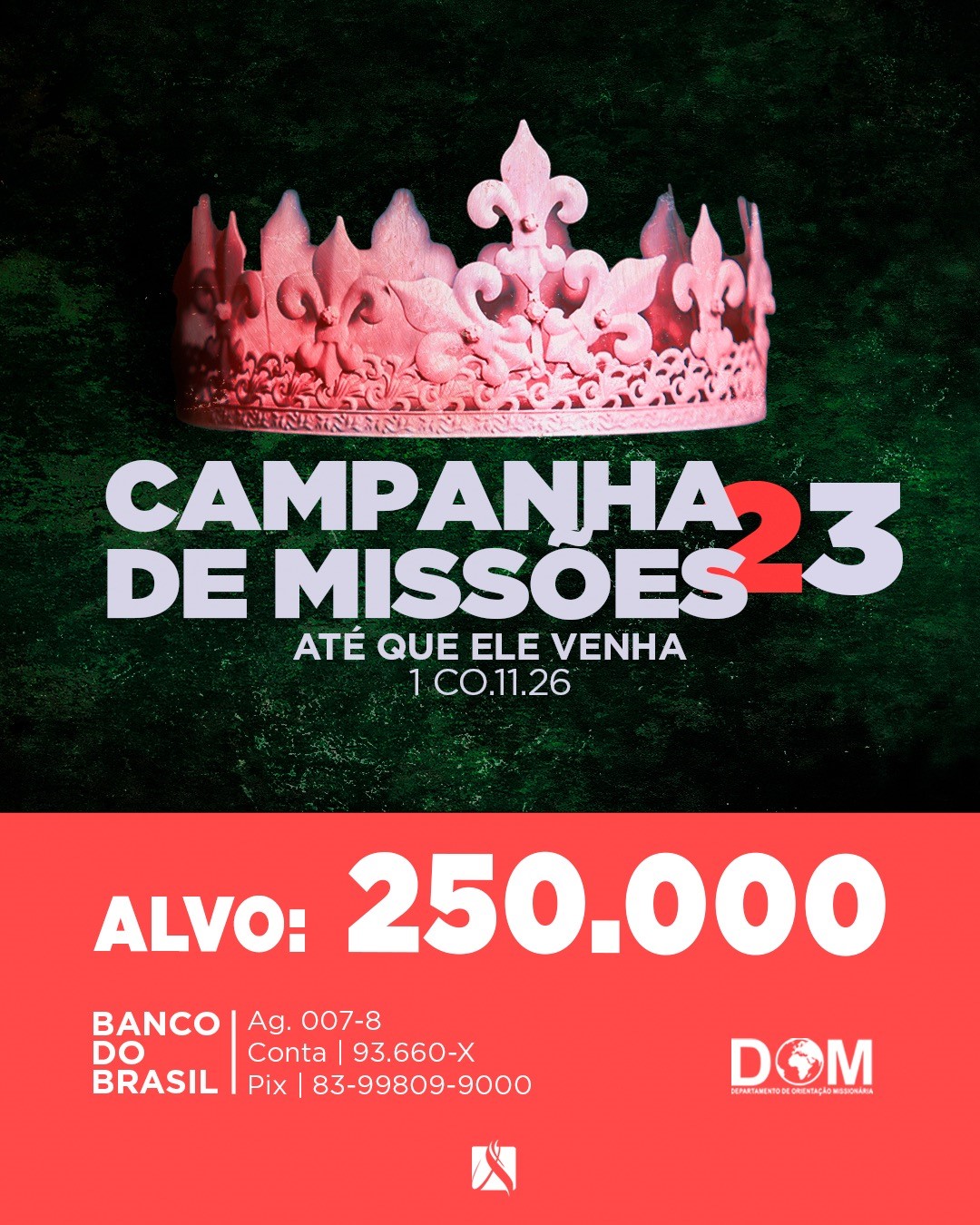 Através de uma carta o DOM informou a cada Igreja de nossa denominação o Alvo Missionário local; caso alguma dessas Igrejas não tenha recebido essa informação, favor entrar em contato conosco através do telefone (83) 99809 9000, bem como deixamos aberta a possibilidade de solicitar nossos respectivos materiais de divulgação para apresentação em sua Igreja local.