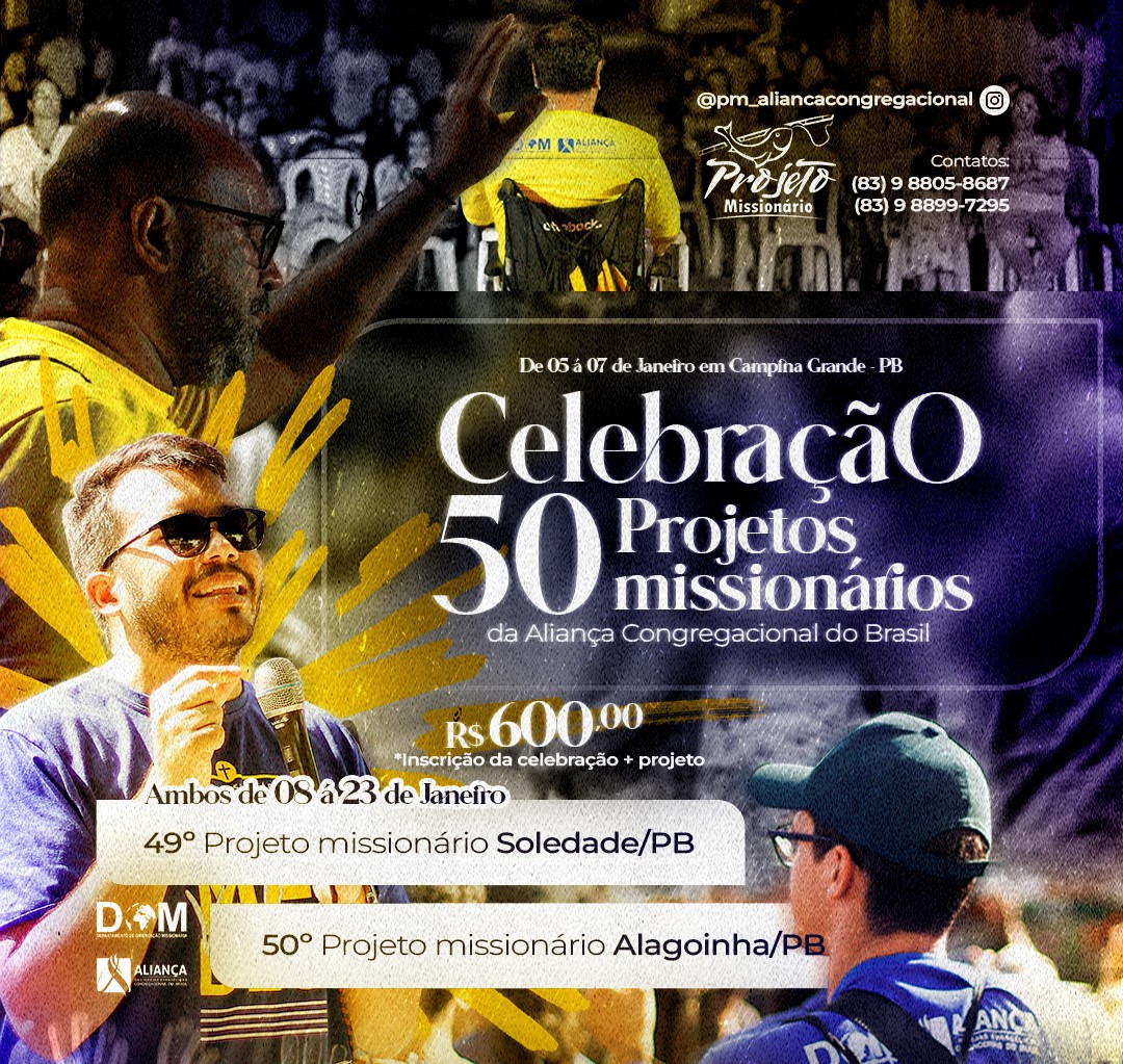 Celebrar o 50º Projeto Missionário da Aliança é, para nós, motivo de grande alegria, agradecimento e gratidão ao Senhor por tantos projetos que tivemos o privilégio de vivenciar com tantos irmãos e irmãs. Estes, com muita dedicação e satisfação, se envolveram com o trabalho da evangelização e com os processos de plantação e revitalização de igrejas no Nordeste, Sudeste, Sul e Centro Oeste do Brasil.