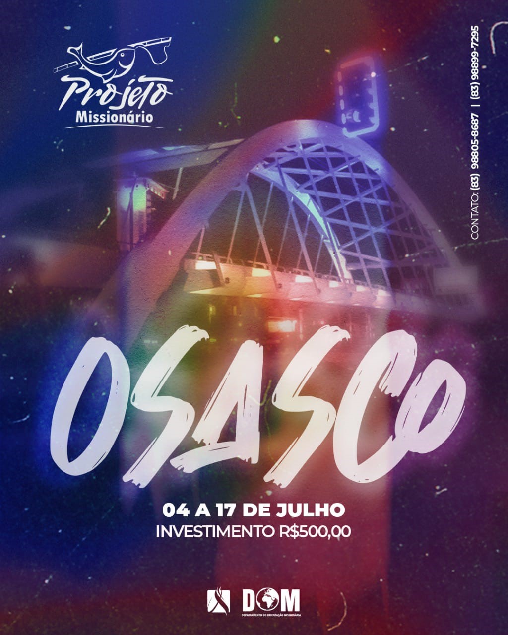 No mês de julho/2023 , do dia 04 ao dia 17, em Osasco-SP, acontecerá mais uma edição do Projeto Missionário da Aliança, em apoio à Igreja Congregacional de Osasco. Sob a liderança do Pb. José Vieira, esse Campo Missionário esta IEC estância em Recife PE.